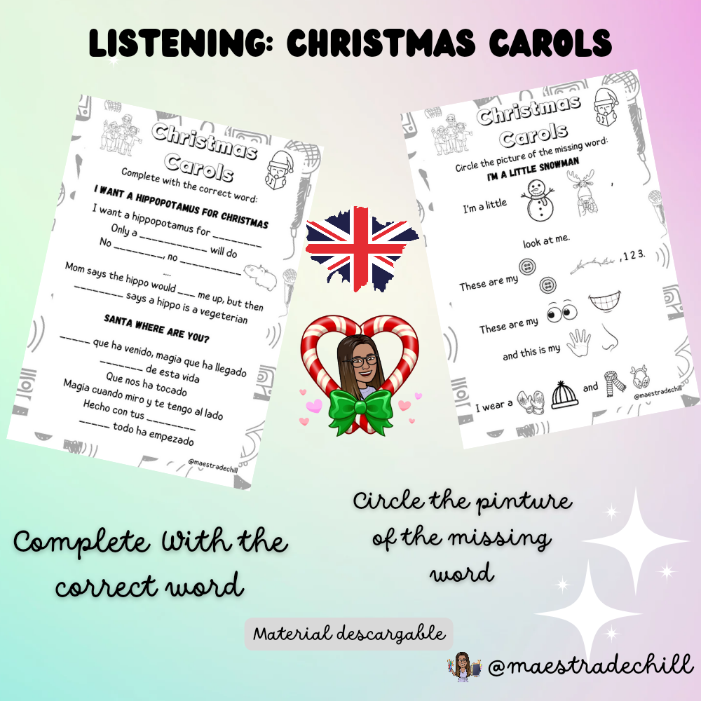 🎶🎨🎄 4 villancicos navideños en español (dos clásicos y dos modernos) con parte de la letra de la canción y huecos en los que habrá que elegir entre dos dibujos cuál es el correcto a ese trozo de canción EN INGLÉS.