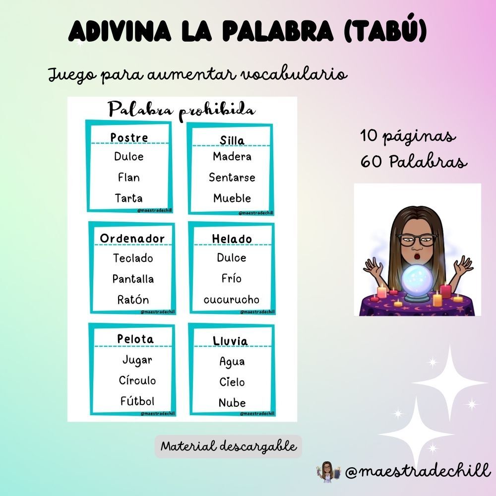 Es el clásico juego de tabú, palabra prohibida.... en la cual uno de los alumnos/as tiene las tarjetas y el resto del alumnado tiene que adivinar la palabra inicial de arriba. El alumno que tiene las tarjetas tiene que describir las palabras sin decir las palabras prohibidas, es decir, las palabras que están en la parte de abajo de la que se tiene que adivinar.