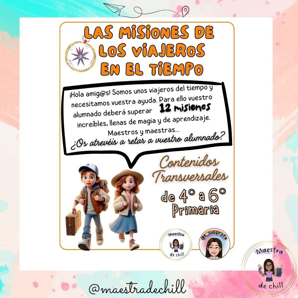 Presentamos un súper recurso que el alumnado de 4°, 5° y 6°, y el profesorado disfrutará mucho, ¡Los viajeros del tiempo! Donde deberán ayudar a Luca y Ariadna a superar 12 misiones increíbles para ayudarles a volver a su época.