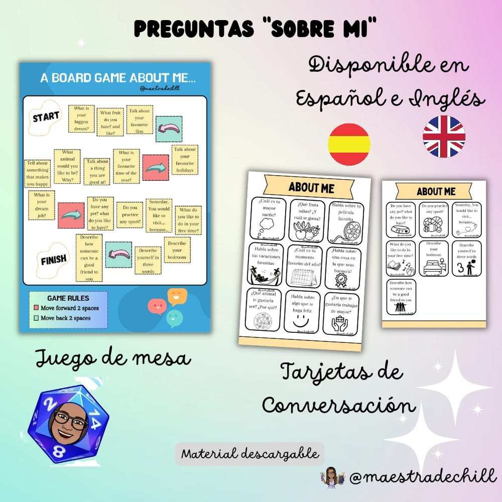 🎲🗣Juego de mesa sobre mi con preguntas ( en inglés y español)